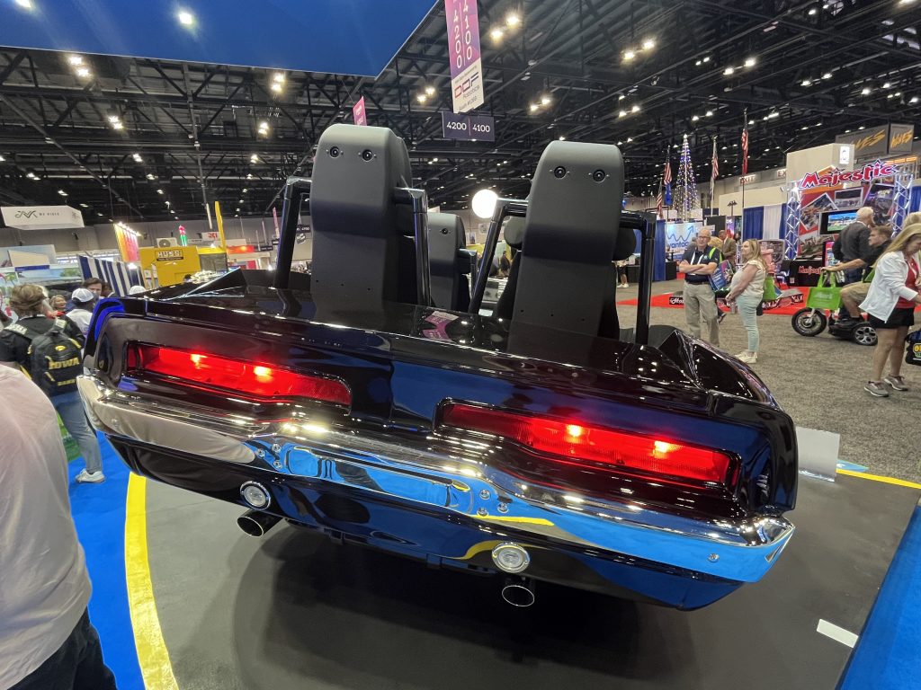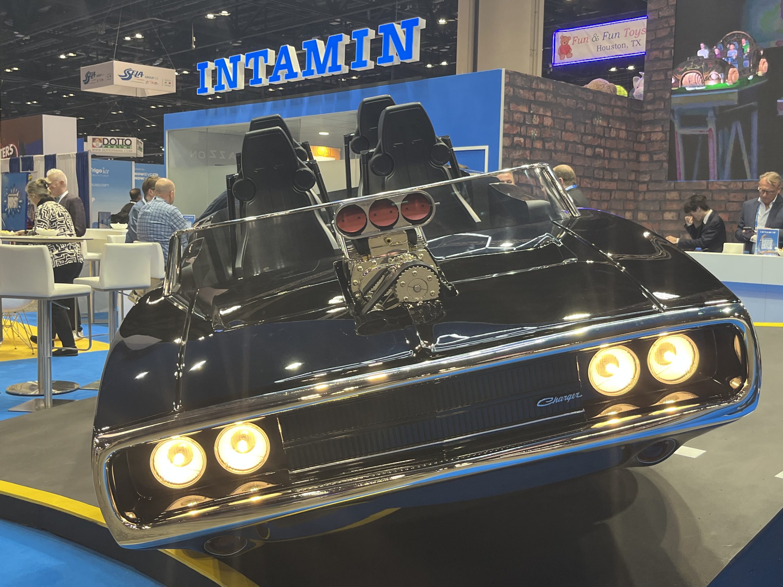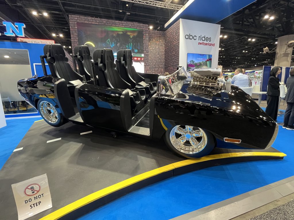 More sedate and serene than Fast & Furious. Intamin had the vehicle for Universal Studios Hollywood‘s Fast & Furious: Hollywood Drift spinning launch coaster casually parked on the show floor. Not a sheet in sight. It looked glorious!