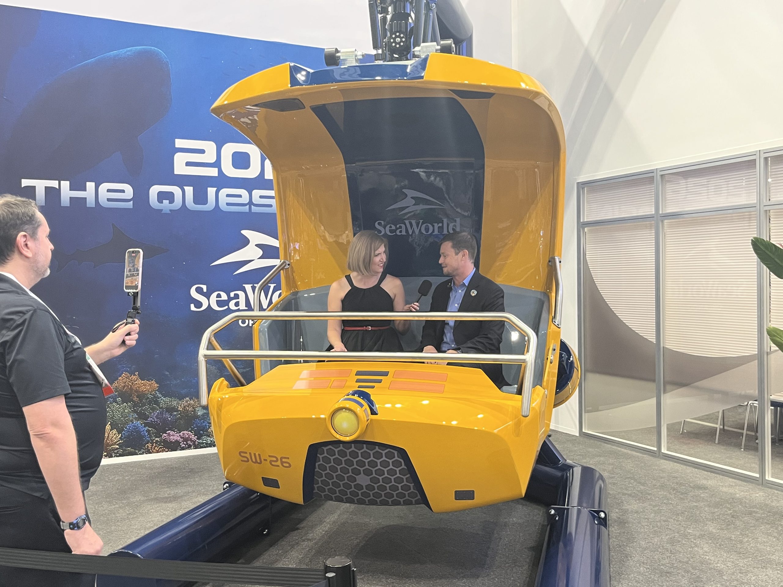 Next up, Vekoma and Seaworld Orlando didn’t faff about with long speeches, instead opting for a refreshingly short sheet-whip to unveil the vehicle for SEAQuest: Legends of the Deep. Riders will take a deep dive into the mysteries of the sea on an innovative suspended dark ride.