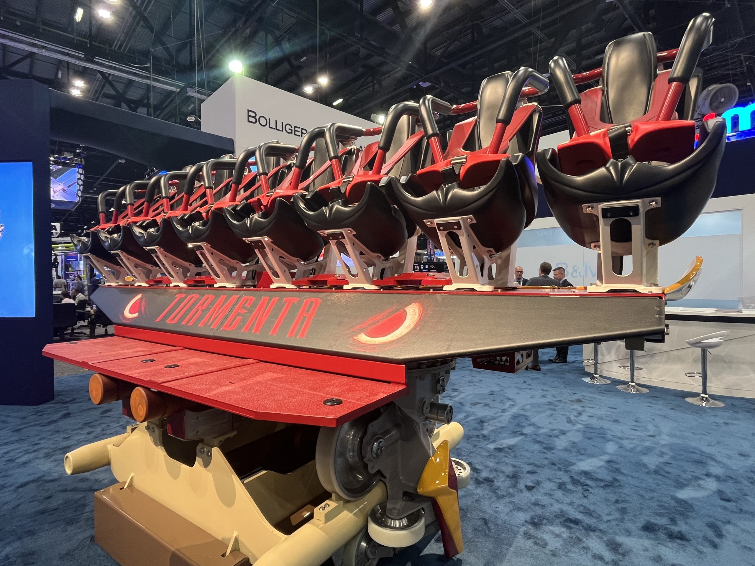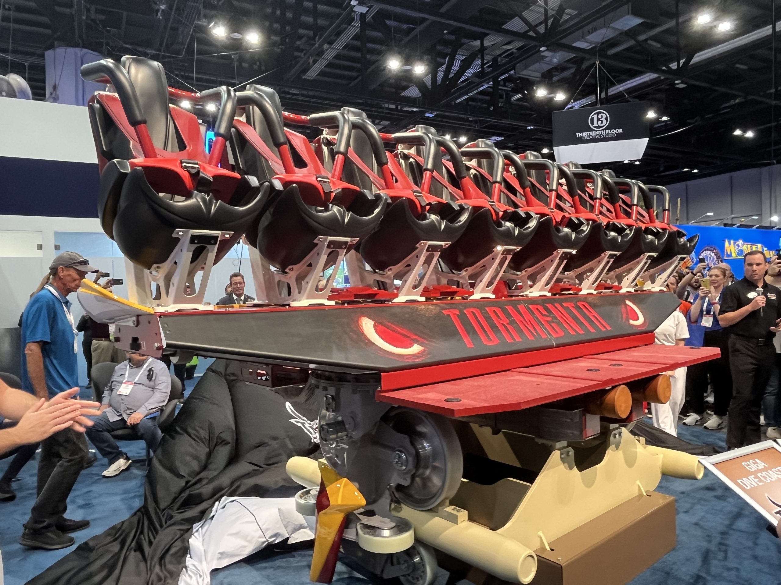 Thankfully, there was no real life bull under the sheet on the B&M booth. Instead, sat a front train for what will be the world’s longest, tallest and fastest Dive Coaster in the world. Tormenta at Six Flags Over Texas will also feature the world’s tallest vertical loop.