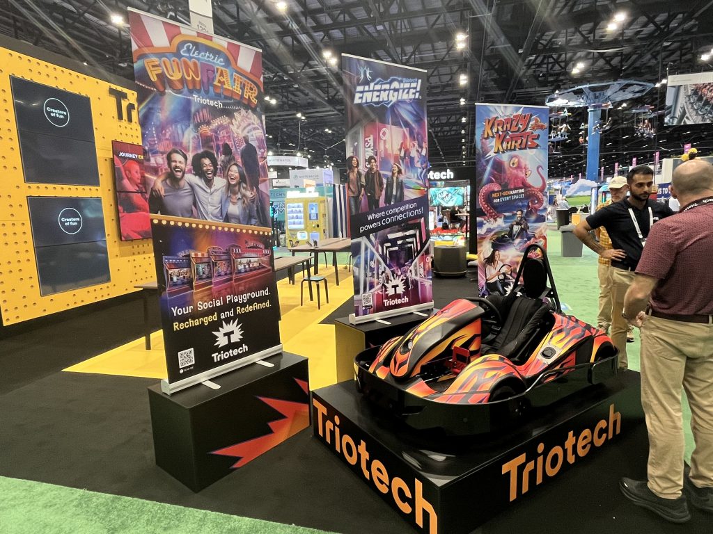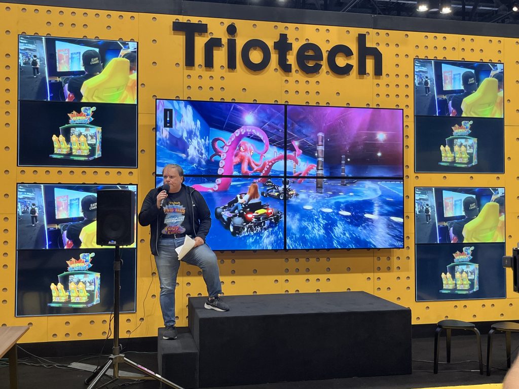 Staying indoors, Ernest Yale, Triotech‘s denim-jean-wearing flamboyant founder, put “trio” and “tech” together to introduce three new attractions. ‘Electric Funfair’ is a changeable screen based throw ball game. ‘Krazy Karts’ is a Mario Kart style virtual track based on the building it’s in and will eventually use AR. ‘Energize’ is an interactive room that resembles a mix of a dance pad floor and touchscreen walls.